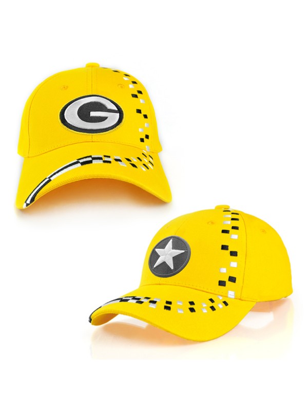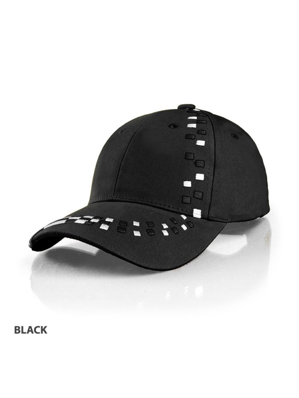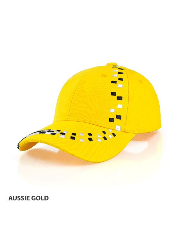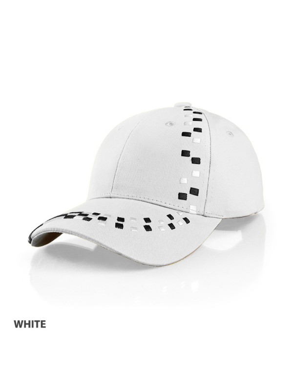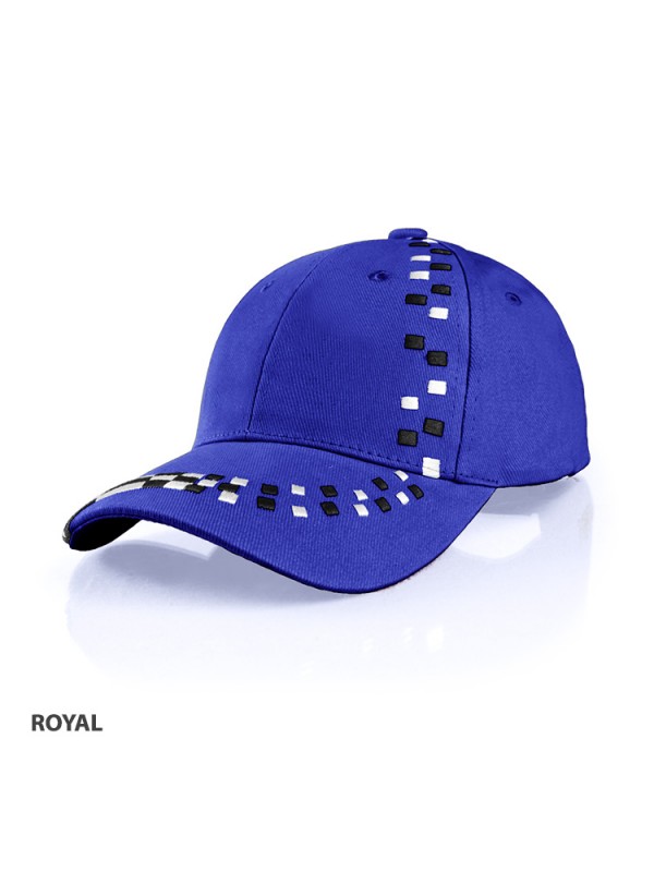 Embroidered checker design across peak and front right panel